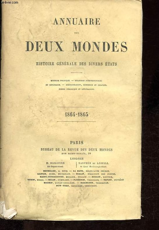 Bureau de la revue des deux mondes. 1866. In-8. Broché. Etat d'usage, Tâchée, Coiffe en pied abîmée, Non coupé. 1004 pages - papier jauni, quelques rousseurs, coins frottés, dos plié, petite déchirure en pied du 1er plat, 2e plat rogné en coin en pied.. . . . Classification Dewey : 900-GEOGRAPHIE, HISTOIRE, SCIENCES AUXILIAIRES DE L'HISTOIRE