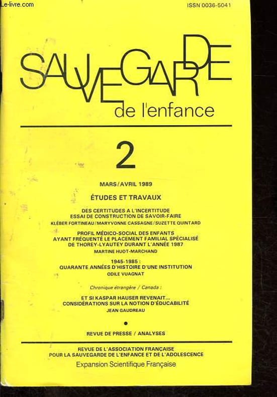 Sommaire: Des certitudes à l'incertitude, essai de construction de savoir-faire - Profil médico-social des enfants ayant fréquenté le placement familial spécialisé de Thorey-Lyautey durant l'année 1987 - 1945-1985: quarante années d'histoire d'une institution - Et si Kaspar Hauser revenait...considérations sur la notion d'éducabilité. Classification Dewey : 70.49-Presse illustrée, magazines, revues