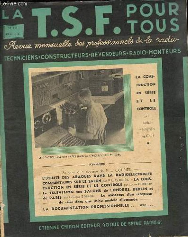 Sommaire: L'utilité des abaques dans la radioélectricité - Commentaires sur le salon - La construction en série et le controle - La télévision aux salons de Londres, Berlin et Paris - La naissance d'un récepteur de série dans une usine modèle allemande - La documentation professionnelle etc. Classification Dewey : 70.49-Presse illustrée, magazines, revues