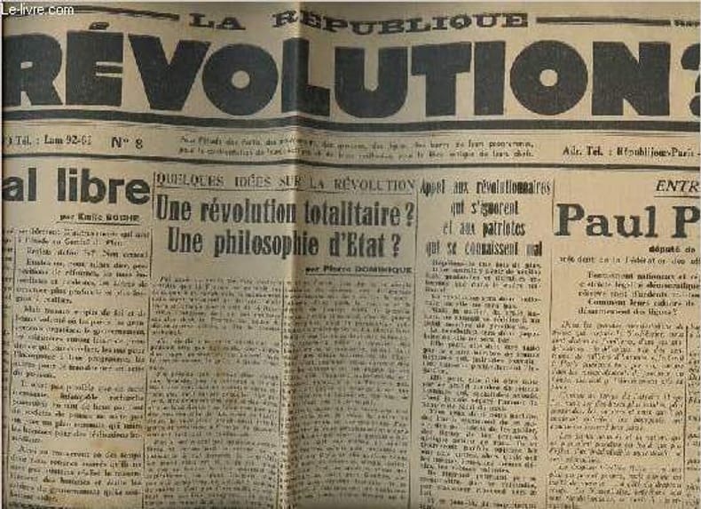 Sommaire: Journal libre - Le mouvement paysan - Une révolution totalitaire ? Une philosophie d'Etat ? - Entretien avec Paul Perrin - Rien que la République - La mystique grandeur d'un pays - L'action française - Le marxisme après Marx - La Russie soviétique et la démocratie - La France est-elle conquise par la pensée marxiste ? - Plan des Volontaires Nationaux qui ont quitté le mouvement des Croix de feu - Jeunesse trahie - etc. Classification Dewey : 70.1-Journaux