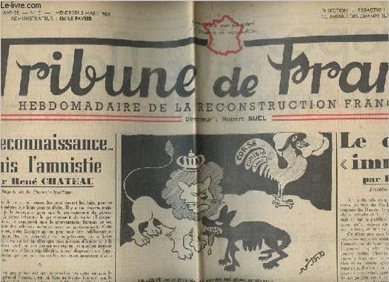 Tribune de France. 1939. In-Folio. En feuillets. Etat d'usage, Couv. légèrement pliée, Dos satisfaisant, Quelques rousseurs. non paginé 8 pages en feuillets, quelques photos et illustrations en noir et blanc dans le texte, texte en plusieurs colonnes - papier jauni.. . . . Classification Dewey : 70.1-Journaux