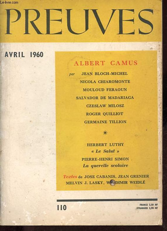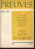 Preuves. 1960. In-8. Broché. Etat d'usage, Coins frottés, Coiffe en tête abîmée, Papier jauni. 96 pages, nombreuses illustrations en noir et blanc dans le texte, une planche de reproductions en noir et blanc.. . . . Classification Dewey : 70.49-Presse illustrée, magazines, revues
