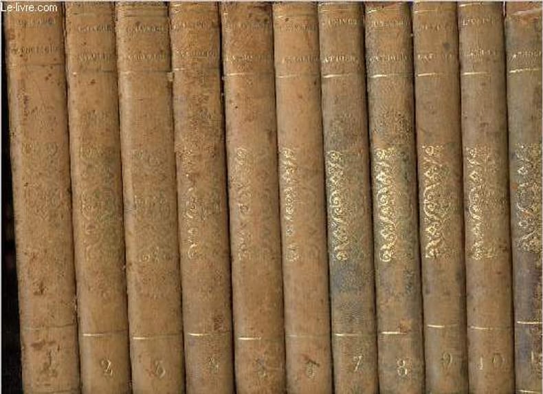 E.-J. Bailly et Cie. 1836. In-8. Relié demi-cuir. Etat d'usage, Coins frottés, Dos frotté, Quelques rousseurs. 575 + 479 + 478 + 480 + 480 + 480 + 480 + 480 + 480 + 480 + 480 + 480 + 480 pages, plats jaspés, titre, tomaison, année et ornements dorés sur les dos, texte en 2 colonnes - papier jauni, tranches et plats frottés, épidermures sur les dos, taches sur le 2e plat du Tome 4 + mors partiellement fendus, coiffes abimées, coiffe en tête du Tome 11 manquante, des Tomes 8 et 13 partiellement désolidarisées.. . . . Classification Dewey : 260-Théologie sociale chrétienne