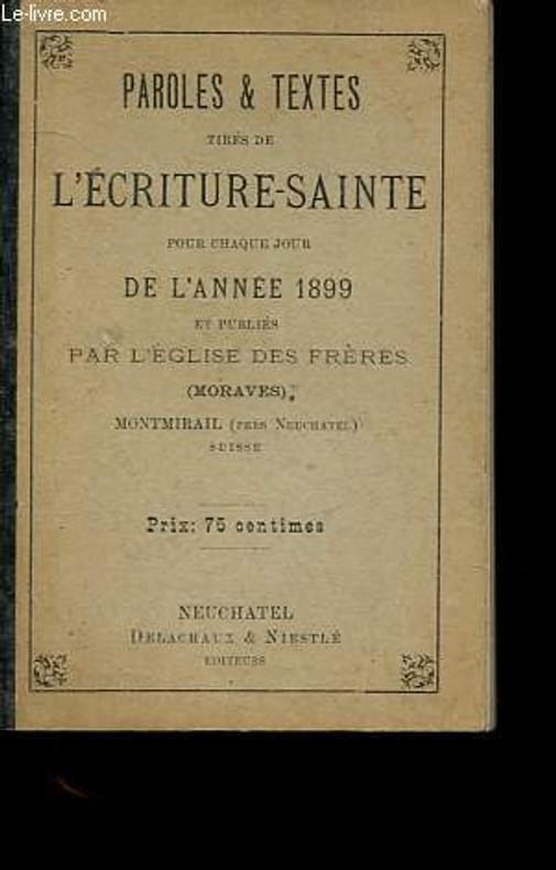 Delachaux & Niestlé. 1899. In-24. Cartonné. Etat d'usage, Coins frottés, Dos abîmé, Papier jauni. 184 pages, signet conservé - petits accro sur le dos, déchirures du papier sur le 2e plat et 2e contreplat, quelques pages tachées en fin d'ouvrage, annotations au crayon couleur en marge de quelques pages.. . . . Classification Dewey : 240-Théologie morale et spirituelle