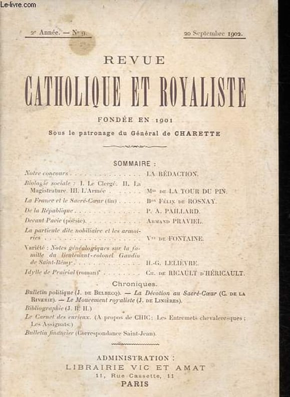 Sommaire: Biologie sociale: Le clergé, La magistrature, L'armée - La France et le Sacré-coeur - De la République - Devant Pavie - La particule dite nobiliaire et les armoiries - Notes généalogiques sur la famille du lieutenant-colonel Gaudin de Saint-Rémy - Idylle de Prairial. Classification Dewey : 70.49-Presse illustrée, magazines, revues