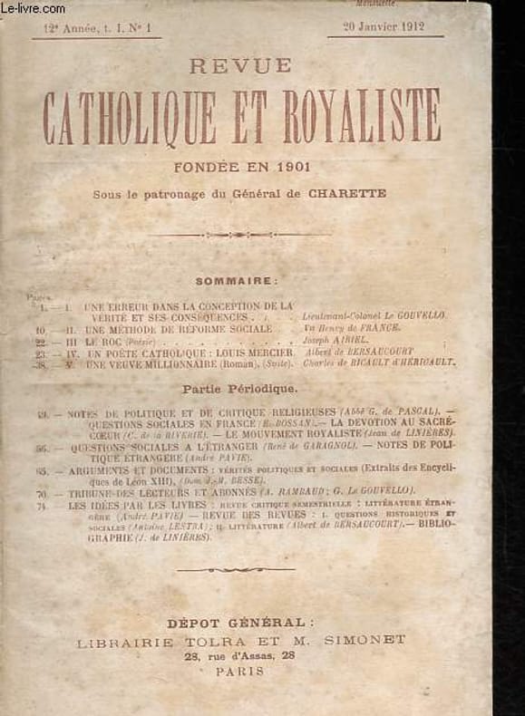 Sommaire: Une erreur dans la conception de la vérité et ses conséquences - Une méthode de réforme sociale - Le roc - Un poète catholique: Louis Mercier - Une veuve millionnaire - Notes de politique et de critique religieuses - Questions sociales en France - La dévotion au Sacré-coeur - Le mouvement royaliste - Questions sociales à l'étranger - Vérités politiques et sociales - etc. Classification Dewey : 70.49-Presse illustrée, magazines, revues