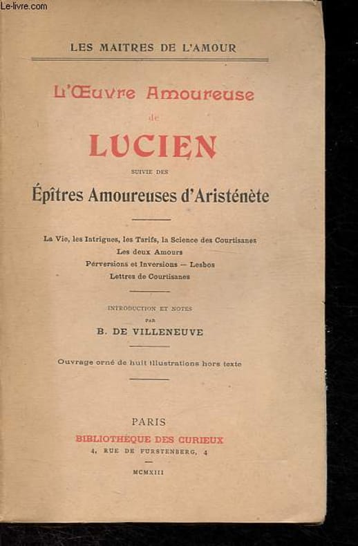 Collection Les maitres de l'amour. Introduction et notes de B. de Villeneuve. Contient: La vie, les intrigues, les tarifs, la science des courtisanes - Les deux amours - Perversions et inversions - Lesbos - Lettres de courtisanes. Classification Dewey : 840.091-XX ème siècle