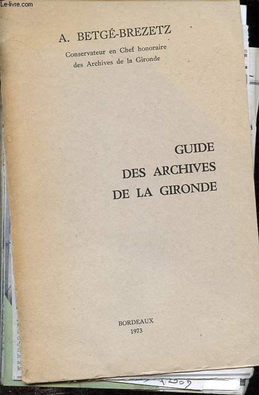 Bon état pour ce livre écrit par un Conservateur en Chef honoraire des Archives de la Gironde. Ouvrage en quatre parties : 1. Introduction - Histoire des archives de la Gironde - La recherche aux Archives de la Gironde ; 2. Les fonds des Archives Départementales de la Gironde ; 3. Les archives communales et hospitalières de la Gironde ; 4. Autres fonds d'archives intéressant l'histoire de la Gironde.