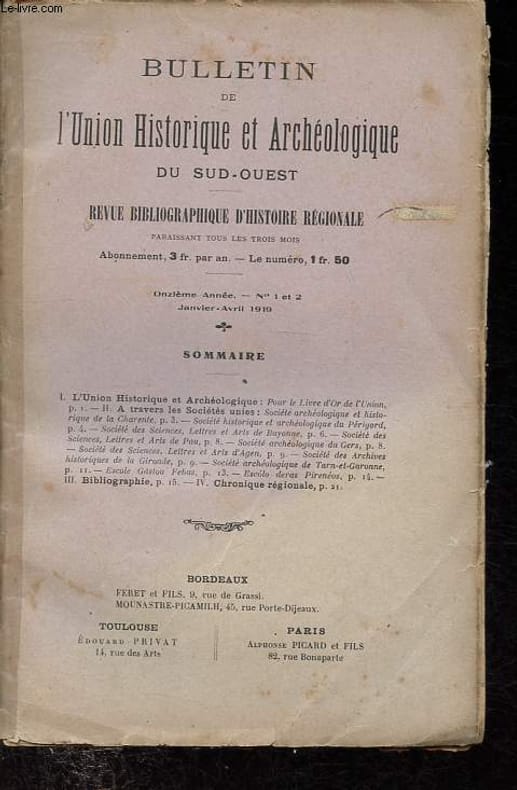 Sommaire: Pour le livre d'Or de l'Union - Société archéologique et historique de la Charente, du Périgord, du Gers - Société des Sciences, Lettres et Arts de Bayonne, de Pau, d'Agen - Gironde - Tarn et Garonne - Escole Gastou Febus - Escolo deras Pireneos. Classification Dewey : 70.49-Presse illustrée, magazines, revues