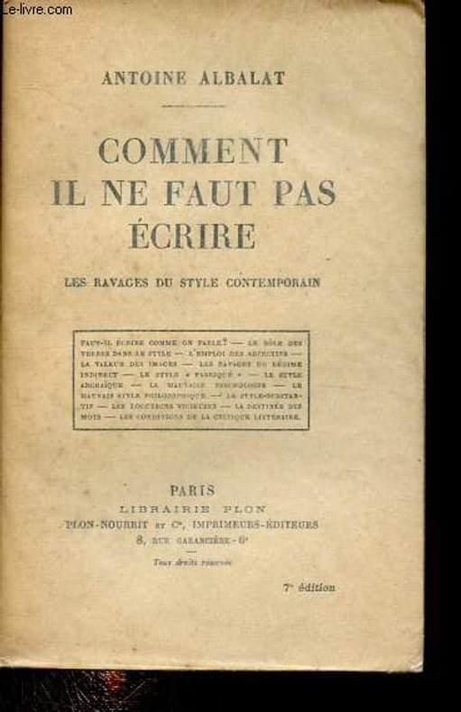 Faut il écrire comme on parle ? - le rôle des verres dans le style - l'emploi des adjectifs - la valeur des images - les ravages du régime indirect - le style fabriqué - le style archaïque - la mauvaise psychologie - le mauvais style philosophique - le style substantif - les locutions vicieuses - la destinée des mots - les conditions de la critique littéraire. Classification Dewey : 440-Langues romanes. Français