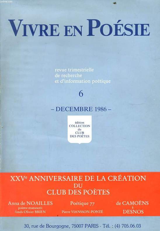 EDITIONS COLLECTION DU CLUB DES POETES. DECEMBRE 1986. In-4. Broché. Bon état, Couv. convenable, Dos satisfaisant, Intérieur frais. 79 pages. . . . . Classification Dewey : 841-Poésie