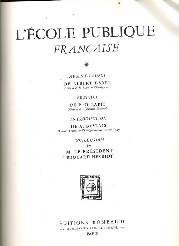 Avant-propos de Albert Bayet, préface de P.-O. Lapie, introduction de A. Beslais, conclusion par Edouard Herriot. Classification Dewey : 370-Education