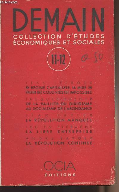Sommaire : Jean Leproux : En régime capitaliste, la mise en valeur des colonies est impossible ; Jacques Rozner : De la faillite du dirigisme au socialisme de l'abondance ; Jean Pupier : La révolution manquée ; Lucien Perruche : La libre entreprise ; André Sarger : La révolution continue ; Pour votre documentation. Classification Dewey : 300-SCIENCES SOCIALES