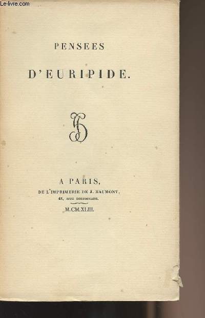 De l'imprimerie de J. Haumont. 1943. In-12. Broché. Etat d'usage, Couv. légèrement passée, Dos plié, Intérieur frais. 86 pages. Ex Libris. Leger accroc sur la couverture.. . . . Classification Dewey : 94.4-Editions numérotées