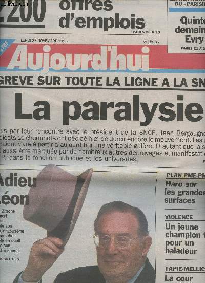 Aujourd'hui. 1995. In-Folio. En feuillets. Bon état, Couv. convenable, Dos satisfaisant, Intérieur frais. 39 pages augmentées de nombreuses photos et illustrations en noir et blanc dans le texte et en couleurs sur les plats.. . . . Classification Dewey : 70.1-Journaux