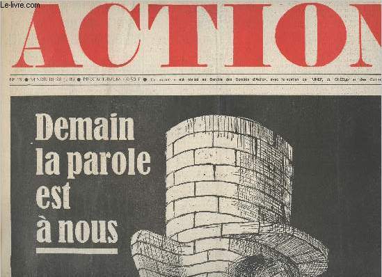 Action. 1968. In-Folio. En feuillets. Etat d'usage, Couv. légèrement passée, Dos satisfaisant, Intérieur acceptable. 4 pages augmentées de quelques photos et illustrations en noir et blanc dans le texte.Texte sur plusieurs colonnes.. . . . Classification Dewey : 70.1-Journaux