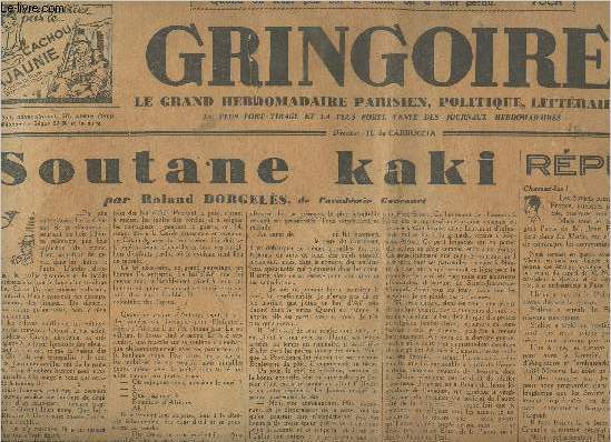 Gringoire. 1940. In-Plano. En feuillets. Etat d'usage, Couv. légèrement passée, Dos satisfaisant, Papier jauni. 12 pages augmentées de nombreuses photos, illustrations et publicités en noir et blanc dans le texte. Texte sur plusieurs colonnes. Journal légèrement déchiré en marge.. . . . Classification Dewey : 70.1-Journaux