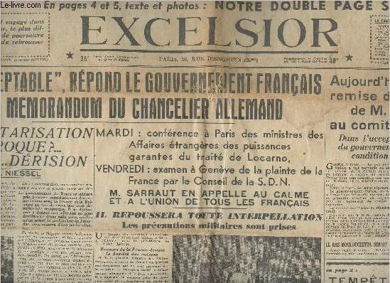 Excelsior. 1936. In-Plano. En feuillets. Etat d'usage, Couv. légèrement passée, Dos satisfaisant, Intérieur acceptable. 8 pages augmentées de nombreuses photos en noir et blanc dans le texte. Texte sur plusieurs colonnes. Legers accrocs sur la première page sans conséquence sur la lecture.. . . . Classification Dewey : 70.1-Journaux