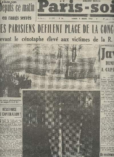 Paris-Soir. 1942. In-Plano. En feuillets. Etat d'usage, Couv. convenable, Dos satisfaisant, Non coupé. 8 pages augmentées de quelques photos en noir et blanc dans le texte. Texte sur plusieurs colonnes. Réimpression intégrale d'après l'original de l'époque.. . . . Classification Dewey : 0-GENERALITES
