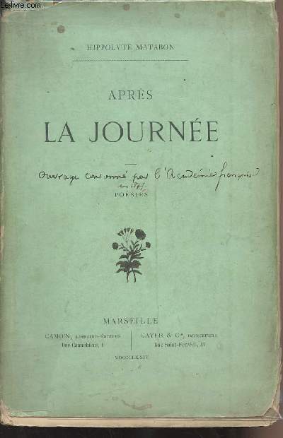 Camoin/Cayer & Cie. 1874. In-8. Broché. Etat d'usage, Couv. convenable, Dos abîmé, Intérieur acceptable. XXXI + 242 pages. 2e plat légèrement déchiré et désolidarisé. 1er plat désolidarisé et annoté à l'encre. Quelques traces de mouillures. Ex libris. Dos cassé.Annotation au crayon de papier en page de garde.. . . . Classification Dewey : 841-Poésie