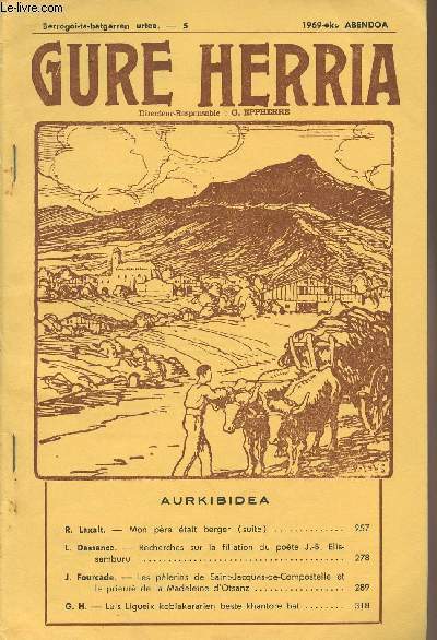 Gure Herria. 1969. In-8. Broché. Etat d'usage, Couv. convenable, Coiffe en pied abîmée, Intérieur frais. Paginé de 258 à 320 - quelques publicités en noir et blanc dans et hors texte. Bandeaux et culs-de-lampe.. . . . Classification Dewey : 499.92-Basque