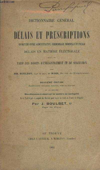 Chez l'auteur. 1902. In-8. Broché. Etat d'usage, Couv. légèrement passée, Dos plié, Quelques rousseurs. 725 pages. Petite annotation au crayon de papier en page de garde et nom écrit à l'encre sur le 1er plat.. . . . Classification Dewey : 340-Droit