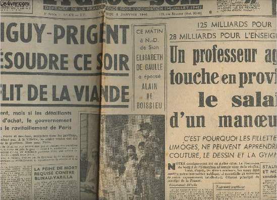 France-Soir. 1946. In-Folio. En feuillets. Bon état, Couv. convenable, Dos satisfaisant, Papier jauni. 2 pages - quelques photos en noir et blanc dans le texte. Texte sur plusieurs colonnes. Journal légèrement déchiré sans conséquence sur la lecture.. . . . Classification Dewey : 70.1-Journaux