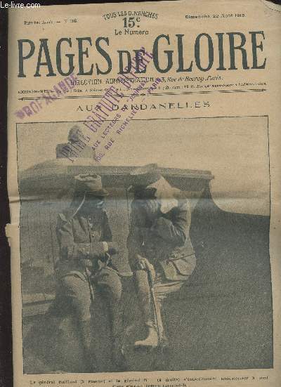 Pages de Gloire. 1915. In-12. Broché. Etat d'usage, Couv. légèrement passée, Dos satisfaisant, Papier jauni. 15 pages - nombreuses photos et illustrations en noir et blanc dans et hors texte. Plats désolidarisés. Tampon sur le 1er plat.. . . . Classification Dewey : 70.1-Journaux