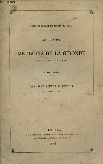 G. Gounouilhou. 1862. In-8. Broché. Etat d'usage, Couv. légèrement passée, Dos satisfaisant, Quelques rousseurs. 24 pages.. . . . Classification Dewey : 610-Sciences médicales. Médecine