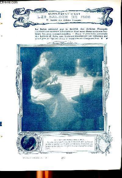 Planches de plus de 50 reproductions de tableaux de peintres parmi lesquels : Vasarri, Royer, Lenoir, P. Thomas, Tattegrain, Levé, Buland, Girardet,, Kowalsky, Leloir, Rochegrosse, Lavergne, Chabas, Baschet, etc.... L'émeute dans la région du Nord - Clémenceau devant le lit de mort du lieutenant Lautour, à Lens, grvaure par Sabattier. La destruction de San francisco, illustré d'un paln de la ville et de photos. Société nationale des Beaux Arts : planches de 13 reproductions de tableaux (Caro-Devaille , La Touche, Lhermitte, Roll, Bunny, Guillaume, etc...). Classification Dewey : 70.4417-L'illustration / Figaro salon