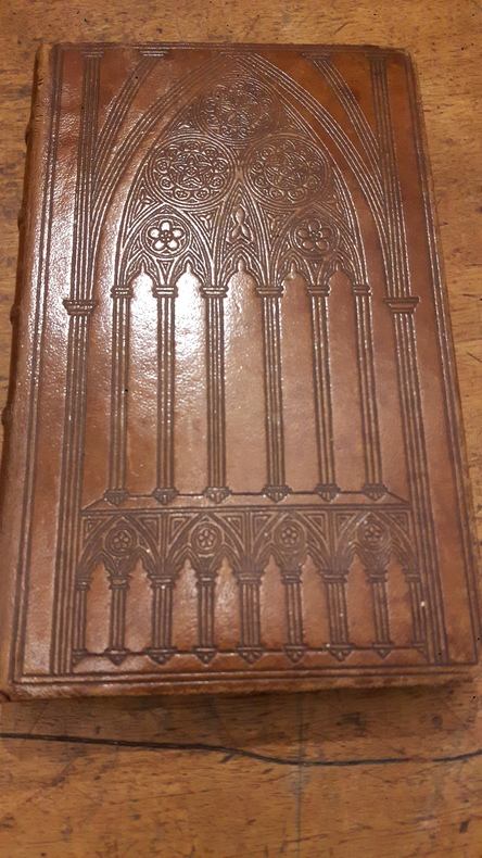 "Alfred Mame et Fils. 1927. In-12. Relié plein cuir. Bon état, Coins frottés, Dos à nerfs, Intérieur frais. 256 pages augmentées de nombreuses gravures en couleurs dans texte et hors texte avec serpente. Reliure plein cuir marron. Fleurons. Titre doré sur pièce de titre avec les initiales ""M.A.B."" sur la coiffe en pied. Décos sur premier plat. TRanches dorées. Tranches fines en couleurs. Roulettes sur contreplats. Gardes et contreplats marbrés. Frontispice en couleurs de "" La cathédrale de Reims"" avec serpente.. . . . Classification Dewey : 264-Le culte"