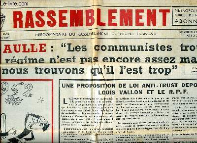 Sommaire: Une proposition de loi anti-trust déposée par Louis Vallon et le R.P.F.; De Gaulle dit comment réaliser une communauté européenne... Classification Dewey : 70.49-Presse illustrée, magazines, revues
