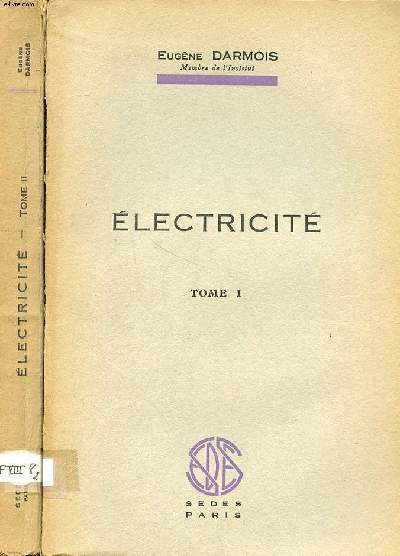 Etiquette sur coiffe en pied. Tampon bibliothèque. Tomes 1 et 2. Tome 1: Notions générales sur es courants continus, applications, apercçu sur les courants alternatifs Tome 2: Etude complémentaire des courants continus, courants alternatifs, applications. Tome 1: 15è édition, tome 2: 12è édition. Classification Dewey : 537-Electricité