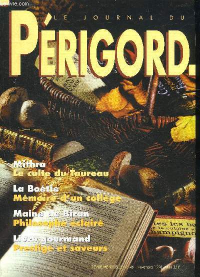 SOMMAIRE : Mithra le culte du Taureau - la boétie mémoire d'un collège - Maine de Biran - philosophe éclairé - livre gourmand prestige et saveurs. Classification Dewey : 908.447-Régionalisme : Aquitaine