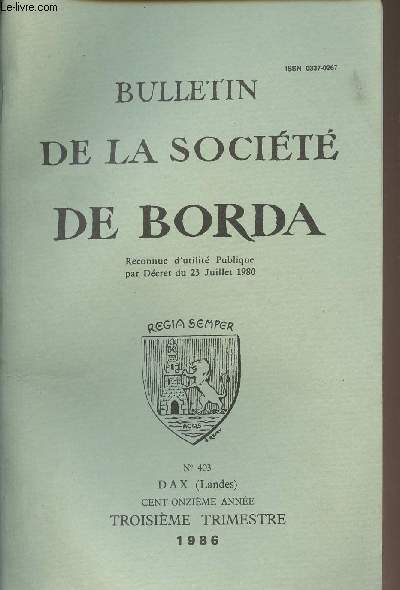 SOCIETE DE BORDA. 1986. In-8. Broché. Bon état, Couv. convenable, Dos satisfaisant, Intérieur frais. Paginé de 236 à 357 - quelques figures en noir et blanc dans et hors texte. Pages légèrement collées en coiffe en tête, sans conséquences sur le texte.. . . . Classification Dewey : 908.447-Régionalisme : Aquitaine