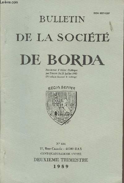 SOCIETE DE BORDA. 1989. In-8. Broché. Bon état, Couv. convenable, Dos satisfaisant, Intérieur frais. Paginé de 114 à 302 - quelques figures en noir et blanc dans et hors texte.. . . . Classification Dewey : 908.447-Régionalisme : Aquitaine