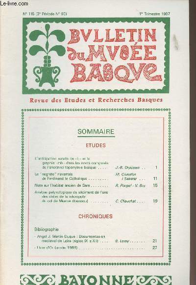 "SOMMAIRE : ETUDESL'anticipation nasale de - b- et la graphie -mb- dans les noms composés de l'ancienne toponymie basque, J.-B. Orpustan - Le ""negrete"" navarrais de Ferdinand le Catholique, M. Crusafon i Sabater - Note sur l'habitat ancien de Sare, R. Poupel - V. Bru - Analyse palynologique du sédiment de l'une des cistes de la nécropole du col de Meatse (Itxassou), C. Chauchat - CHRONIQUES Angel J. Martin-Duque : Documentacion medieval de Leire, B. Leroy - Livre d'Or (année 1986) Classification Dewey : 908.447-Régionalisme : Aquitaine"