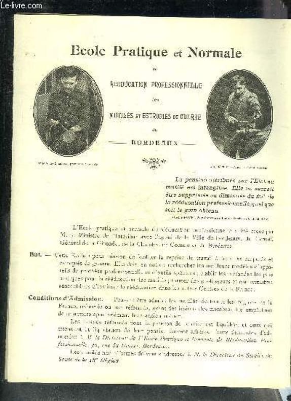 But, conditions d'admission, régime de l'école, nature de l'enseignement, examens d'entrée, entrainement spécial des mutilés des membres supérieurs, appareils de prothèse, avantages réservés aux élèves. Classification Dewey : 908.447-Régionalisme : Aquitaine