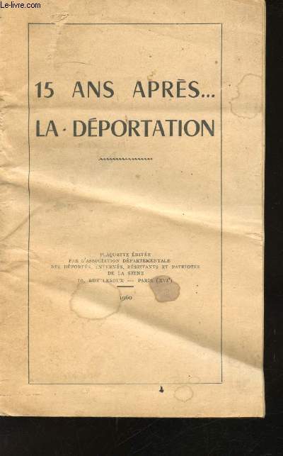 L'association départementale des déportés, internés, résistants et patriotes de la seine. 1960. In-12. Broché. Etat d'usage, Tâchée, Dos satisfaisant, Papier jauni. 31 pages augmentées de quelques photos en noir et blanc dans le texte. Rousseurs, mors légèrement fendus.. . . . Classification Dewey : 940.53-Seconde Guerre mondiale 1939-1945