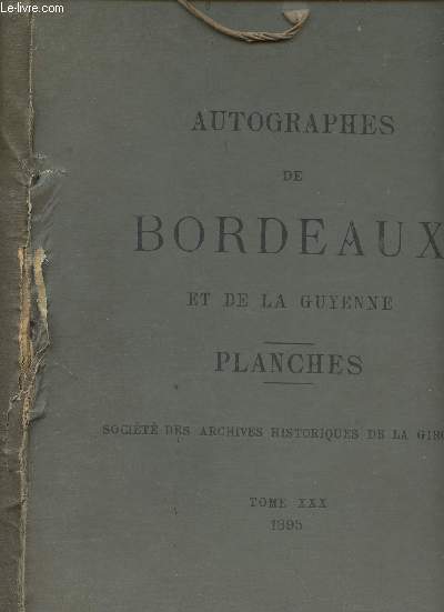 Société des Archives Historiques de la Gironde. 1895. In-4. En feuillets. Etat d'usage, Couv. légèrement passée, Dos abîmé, Quelques rousseurs. 105 planches (collationnées) en noir et blanc et monochromes en feuillets, dont 9 doubles. Numérotées de 1 à 104, planche 85 bis présente. + la planche de table sur feuillet double, légèrement rongée. Le tout dans une chemise toilée rigide avec liens pour refermer les plats. Dos de la chemise déchiré au centre, au niveau du mors.. . . . Classification Dewey : 908.447-Régionalisme : Aquitaine