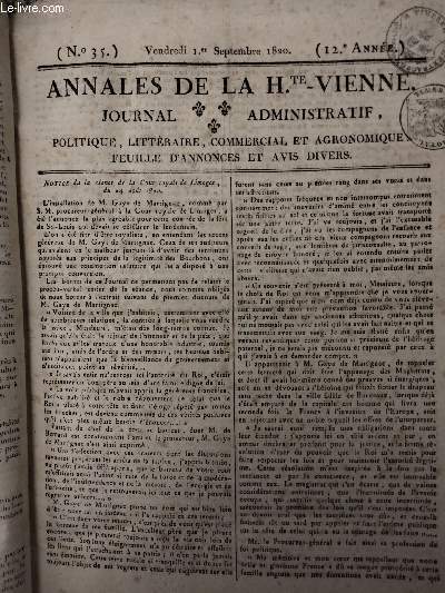 Sommaire : Notice de la séance de la Cour royale de Limoges, du 24 août 1820 - Limoges, le 25 août 1820, jour de St. Louis, Le préfet du département de la Haute-Vienne, officier de l'ordre royal de la légion-d'honneur, commandeur de l'ordre impérial de Léopold d'Autriche à MM. les sous-préfets et maires du même département -Limoges, 26 août - Loterie royale - Paris, 22 août, ordonnances du roi - Annonces judiciaires - Vente immobilière - A vendre de gré à gré - A vendre ou à échanger - Ouvrage nouveau Classification Dewey : 70.1-Journaux