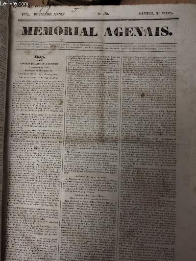 Mémorial Agenais. 1832. In-4. En feuillets. Etat d'usage, Couv. convenable, Dos satisfaisant, Quelques rousseurs. 4 pages en feuillets. Texte sur trois colonnes.. . . . Classification Dewey : 70.1-Journaux