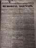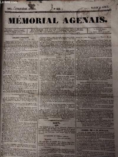 Mémorial Agenais. 1835. In-4. En feuillets. Etat d'usage, Couv. convenable, Dos satisfaisant, Quelques rousseurs. 4 pages en feuillets. Texte sur trois colonnes. Quelques taches. Tampons timbres fiscaux en 1re page.. . . . Classification Dewey : 70.1-Journaux
