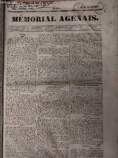 Mémorial Agenais. 1836. In-4. En feuillets. Etat d'usage, Couv. convenable, Dos satisfaisant, Quelques rousseurs. 4 pages en feuillets. Texte sur trois colonnes. Tampon timbre fiscal en 1er page. Annotation à l'encre en 1re page.. . . . Classification Dewey : 70.1-Journaux