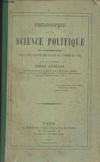 A. Marescq aîné. 1877. In-8. Broché. Etat d'usage, Couv. légèrement passée, Dos satisfaisant, Papier jauni. VII + 524 pages. Renfort sur le dos.. . . . Classification Dewey : 320-Science politique
