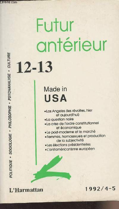"Sommaire : La marche du temps : Los Angeles, l'Europe de Maastricht et le nouvel ordre mondial - Les Angeles Novos - Los Angeles : les libertés civiles entre le marteau et la drogue - L'Amérique noire - La gauche américaine aux antipodes de la citoyenneté républicaine - Gérer l'autre (ou la gestion de l'autre) - Race et art en Amérique - Identités déplacées : la condition ouvrière et le statut du discours de classe aux Etats-Unis - Les Etats-Unis et l'éclatement du système mondial - ""De te fabula narratur"" - La simulation de l'Etat minimal dans l'Amérique de la guerre froide - Les élections présidentielles américaines de 1992 : une nouvelle politique de la clôture - Marché commun américain : intégration et exploitation... Classification Dewey : 973-Etats-Unis"