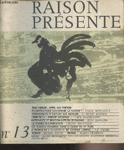 "Sommaire : Jean Meslier : Appel aux prêtres - Préface de Jean Deprun - Entretien - Serge Moscovici : Pourrons-nous gouverner la nature ? - Etudes - Dr Henri Bangou : Personnalité et culture aux Antilles - Paul Giannelloni : L'idée de la ""Science Nouvelle"" - Synthèses - Jean Léonard : Rationalité et irrationalité en économie - Lucien Brunelle : La science de l'éductation - Critique : Les sciences humaines dans le cadre du VIe plan - J.-P. Faure : A propos de l'Agression de Konrad Lorenz - Trimestrielles - Michel Rouzé : Autour de la science.. Classification Dewey : 70.49-Presse illustrée, magazines, revues"