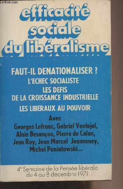 Faut-il dénationaliser ? L'échec socialite, Les défis de la croissance industrielle, Les libéreaux au pouvoir. Avec Georges Lefranc, Gabriel Ventejol, Alain Besançon, Pierre de Calan, Jean Rey, Jean Marcel Jeanneney, Michel Poniatowski... Classification Dewey : 300-SCIENCES SOCIALES