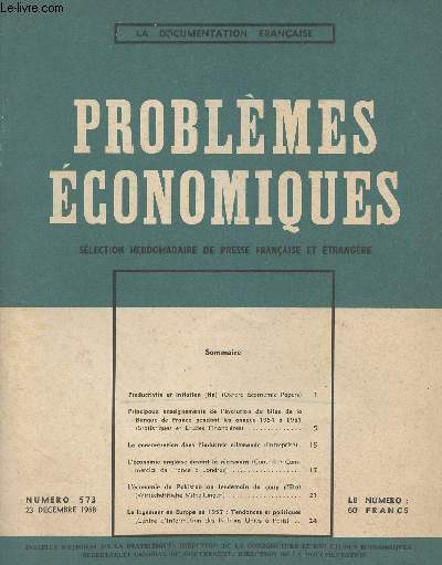 Sommaire : Productivité et inflation (fin) (Oxford Ecornomic Papers) - Principaux enseignements de l'évolution du bilan de la Banque de France pendant les années 1954 à 1957 (Statistiques et études financières) - La concentration dans l'industrie allemande (Entreprise) - L'économie anglaise devant la récession (Conseiller commercial de France à Londres) - L'économie du Pakistan au lendemain du coup d'état (Wirtschaftliche Mitteilungen) - Le logement en Europe en 1957 : tendances et politiques (Centre d'information des Nations Unies à Paris) Classification Dewey : 70.49-Presse illustrée, magazines, revues