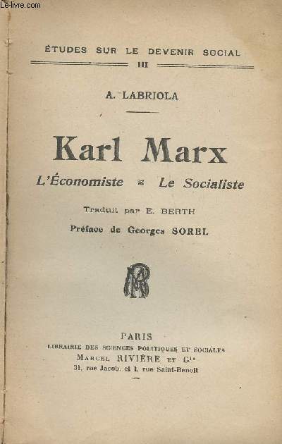 Trad. par E. Berth. Préface de Georges Sorel. Classification Dewey : 923-Politiciens, economistes, juristes, enseignants